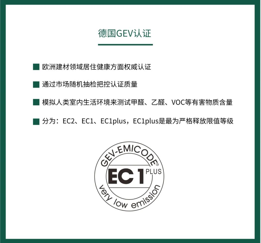 德國GEV—EMICODE環保認證是歐洲建材領域居住健康方面權威認證,GEV所建立的EMICODE環境標志(簡稱EC標志),通過模擬人們生活的室內環境來測試甲醛、乙醛、VOC等有害物質含量,分為三個級別:EC2、EC1、EC1plus,其中EC1plus,對VOC的釋放量、甲醛含量的限值要求更嚴格。而生態家園所獲得的就是最高級別的EC1plus等級認證。
