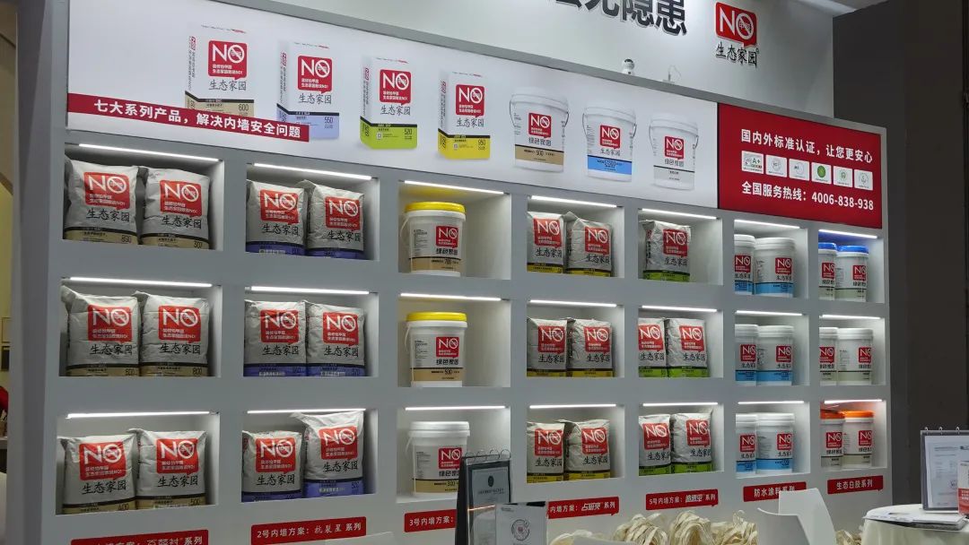 家裝輔材一直是家裝界的無名英雄,默默守護著萬千業(yè)主的家裝安全,作為此次展會唯一內(nèi)墻輔材參展商,生態(tài)家園展現(xiàn)了“三大亮點一體驗”,將23年對家裝輔材產(chǎn)品的沉淀,呈現(xiàn)給廣大需求者,最聚焦的亮點之一便是七大系列產(chǎn)品展示墻,它將生態(tài)家園旗下七大系列產(chǎn)品系統(tǒng)的進行詮釋,讓觀展者清晰了解每款展品的優(yōu)勢與性能,精美的產(chǎn)品外包裝讓觀展者對家裝輔材產(chǎn)品有了新的認知,完整的產(chǎn)品體系從基層處理所需界面處理劑到面層膩子,一站式解決家裝內(nèi)墻所需,全系產(chǎn)品個個零甲醛的承諾也吸引了眾多觀展者接踵而來。