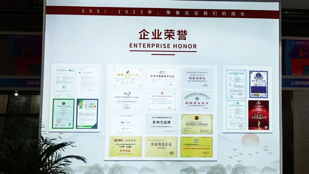 生態(tài)家園展廳第二大亮點便是一整面榮譽展示墻,23年的沉淀與積累,生態(tài)家園是北京市“專精特新”中小企業(yè),同時也是雙高新技術(shù)企業(yè)、知識產(chǎn)權(quán)試點單位,優(yōu)秀的企業(yè)鑄就優(yōu)質(zhì)產(chǎn)品,旗下七大系列產(chǎn)品也通過了中國十環(huán)、法國A+、德國GEV-EC1 plus、芬蘭M1等多項世界嚴苛的環(huán)保認證,為產(chǎn)品的環(huán)保性能做最有力的背書。