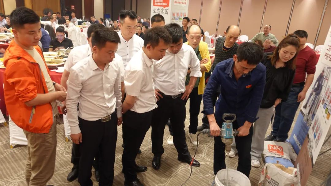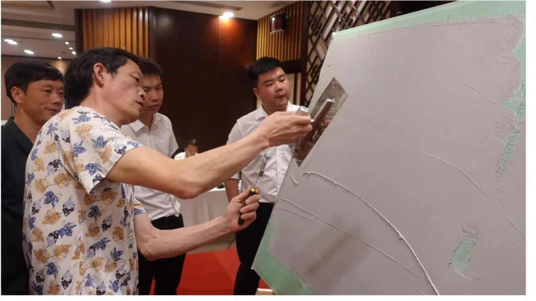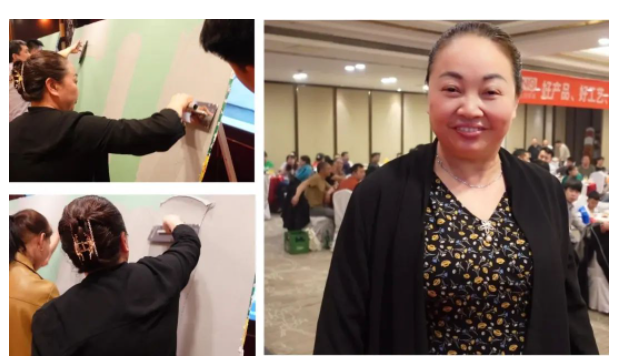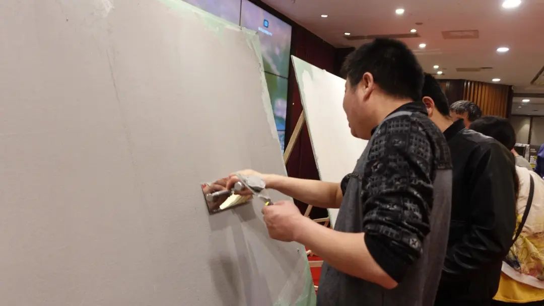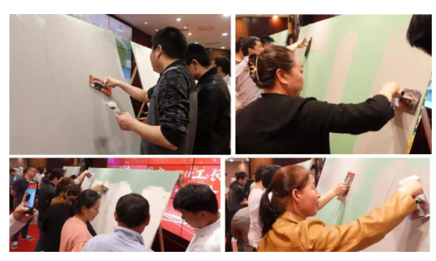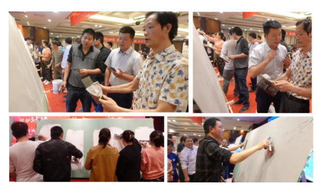 油工師傅通過大區經理劉克正的分享后,在活動的產品體驗時間都爭先恐后地報名,想要感受產品的性能,本次體驗的產品是生態家園膩子粉及明星產品抗裂星550輕質石膏。油工師傅從產品攪拌開始,不論是生態家園百囍襯系列還是抗裂星系列,攪拌時只需要加入清水即可,環保又便捷。首先體驗的是生態家園百囍襯膩子粉系列,油工師傅們在體驗過程中不斷稱贊產品好用,且對于膩子精白細膩感受非常直觀,批刮過后也深入體會了它粘結強度高、干縮強度低,施工性能優異等特點;