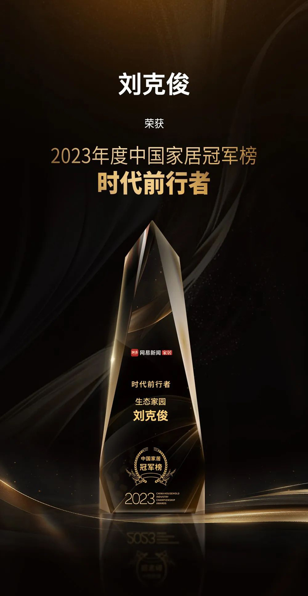生態(tài)家園集團(tuán)董事長劉克俊憑借冠軍實力,攬獲 2023中國家居冠軍榜時代前行者重磅獎項。