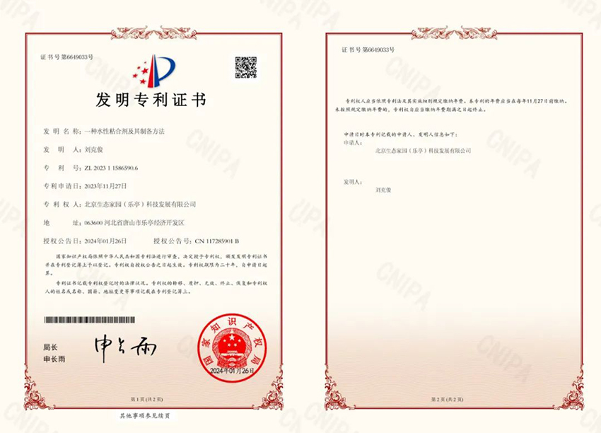 其中,一項名為“一種水性粘合劑及其制備方法”的發明專利,是生態家園集團研發的一系列水性粘合劑的新型環保材料。這種材料具有優異的環保性能,可廣泛應用于家裝輔材的多個領域,有助于減少污染,提高資源利用效率。