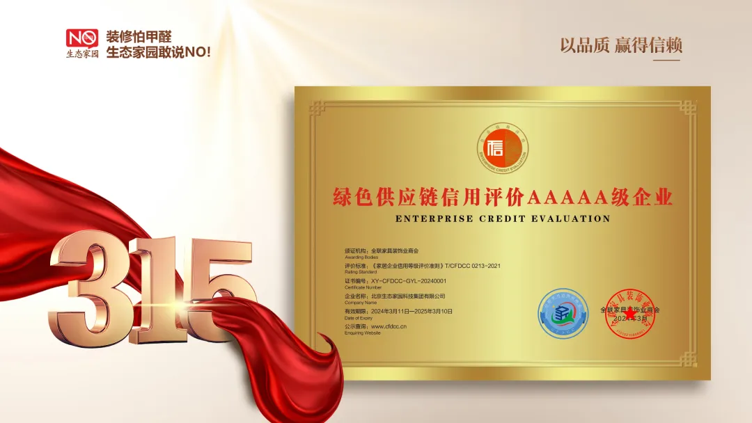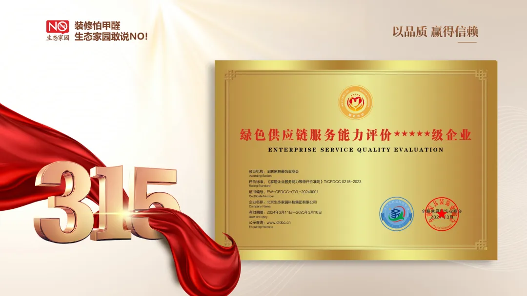 在315國際消費者權(quán)益日到來之際,生態(tài)家園榮獲了綠色供應(yīng)鏈信用評價5A級企業(yè)、綠色供應(yīng)鏈產(chǎn)品質(zhì)量評價5星級企業(yè)、綠色供應(yīng)鏈服務(wù)能力評價5星級企業(yè)三項榮譽(yù)稱號。這是對我們一直以來堅持誠信經(jīng)營,注重綠色發(fā)展的充分肯定。