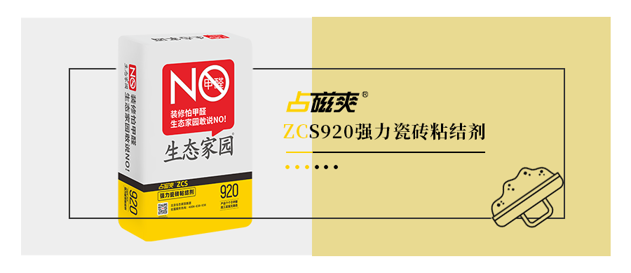 “生態(tài)家園的占磁爽ZCS920強力瓷磚粘結(jié)劑”它是一種聚合物改性的水泥基瓷磚粘結(jié)劑,其施工操作性能、粘結(jié)性能等較之傳統(tǒng)的水泥砂漿有大幅度改善。