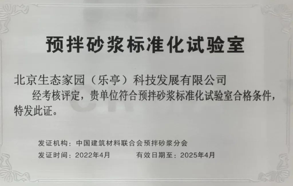 北京生態家園(樂亭)科技發展有限公司 榮獲“預拌砂漿標準化實驗室”;