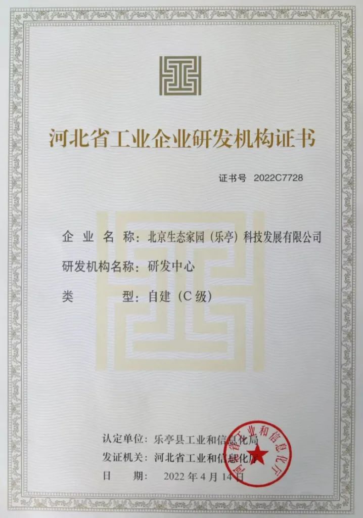 北京生態家園(樂亭)科技發展有限公司 榮獲 “河北省工業企業研發機構證書”