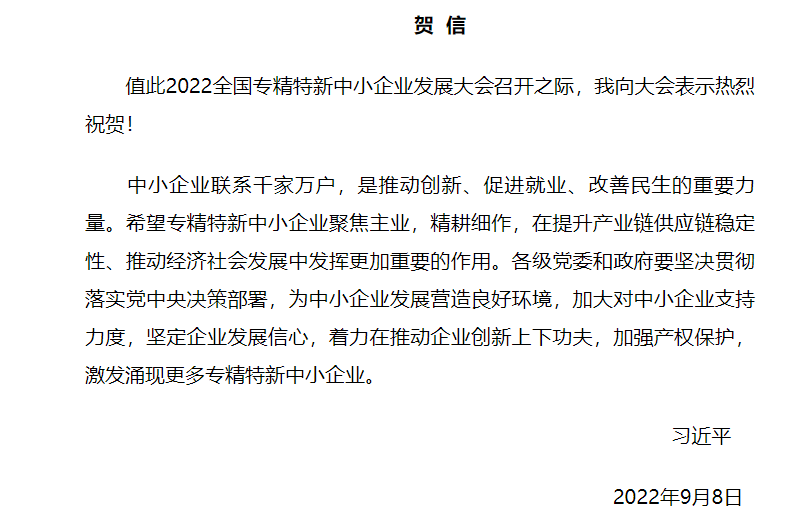 9月8日,主題為“專精特新 強(qiáng)基固鏈”的2022年全國專精特新中小企業(yè)發(fā)展大會(huì)在江蘇南京舉行,屆時(shí)中共中央總書記、國家主席、中央軍委主席習(xí)近平發(fā)來賀信,表示熱烈祝賀。