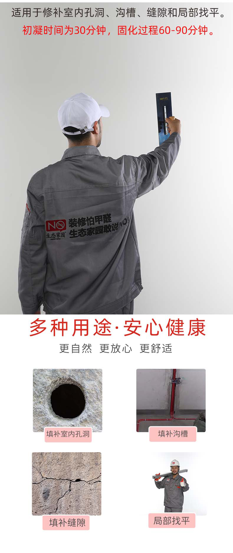 本品是一種以石膏為主要原料和多種添加劑混合而成的墻面修補材料。粘結(jié)強度高、收縮性小、和易性好、施工性能優(yōu)異。適用于修補室內(nèi)孔洞、溝槽、縫隙和局部找平。初凝時間為30分鐘,固化過程60-90分鐘。
